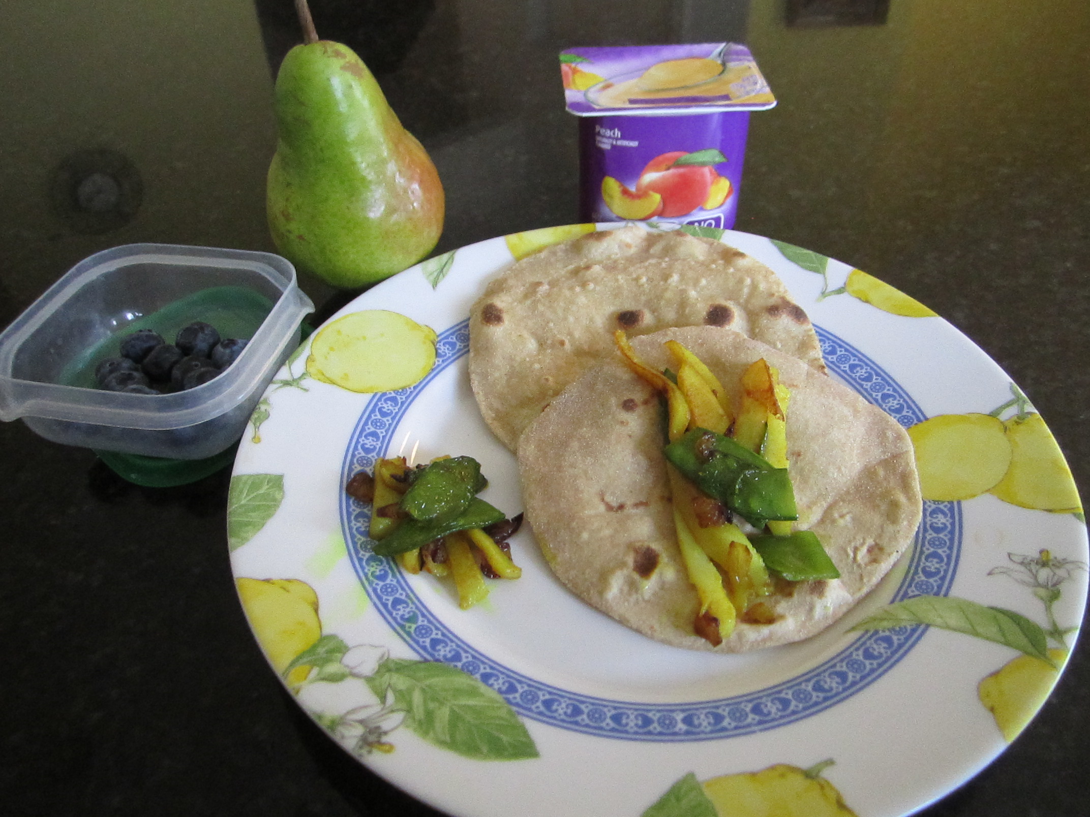 I usually roll this up in a roti made at home with whole wheat flour. This can also be purchased at the Indian store or substituted with tortillas. Since the school day is long, this is supplemented with fruits and yogurt. Often, this is what I have for lunch as well.